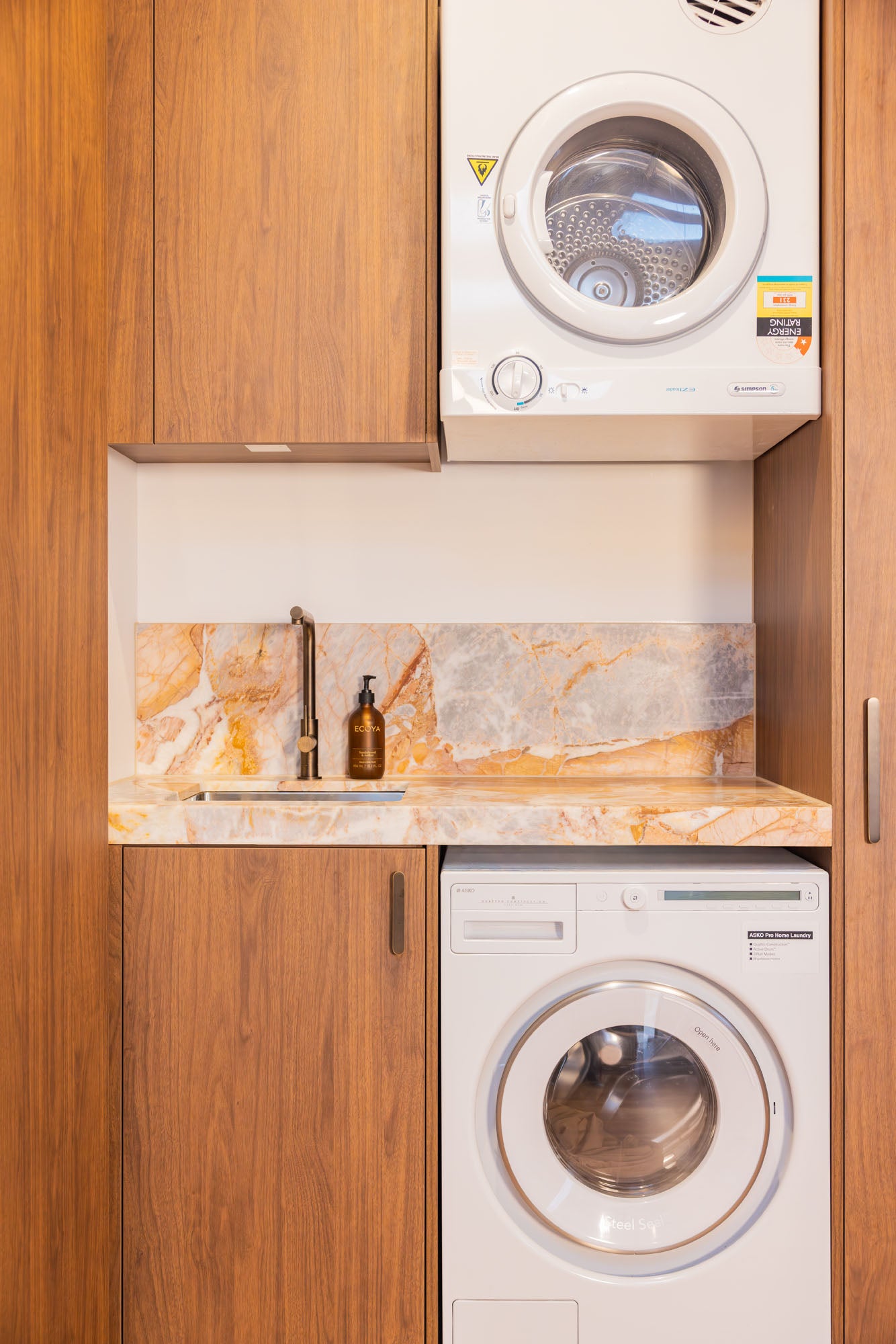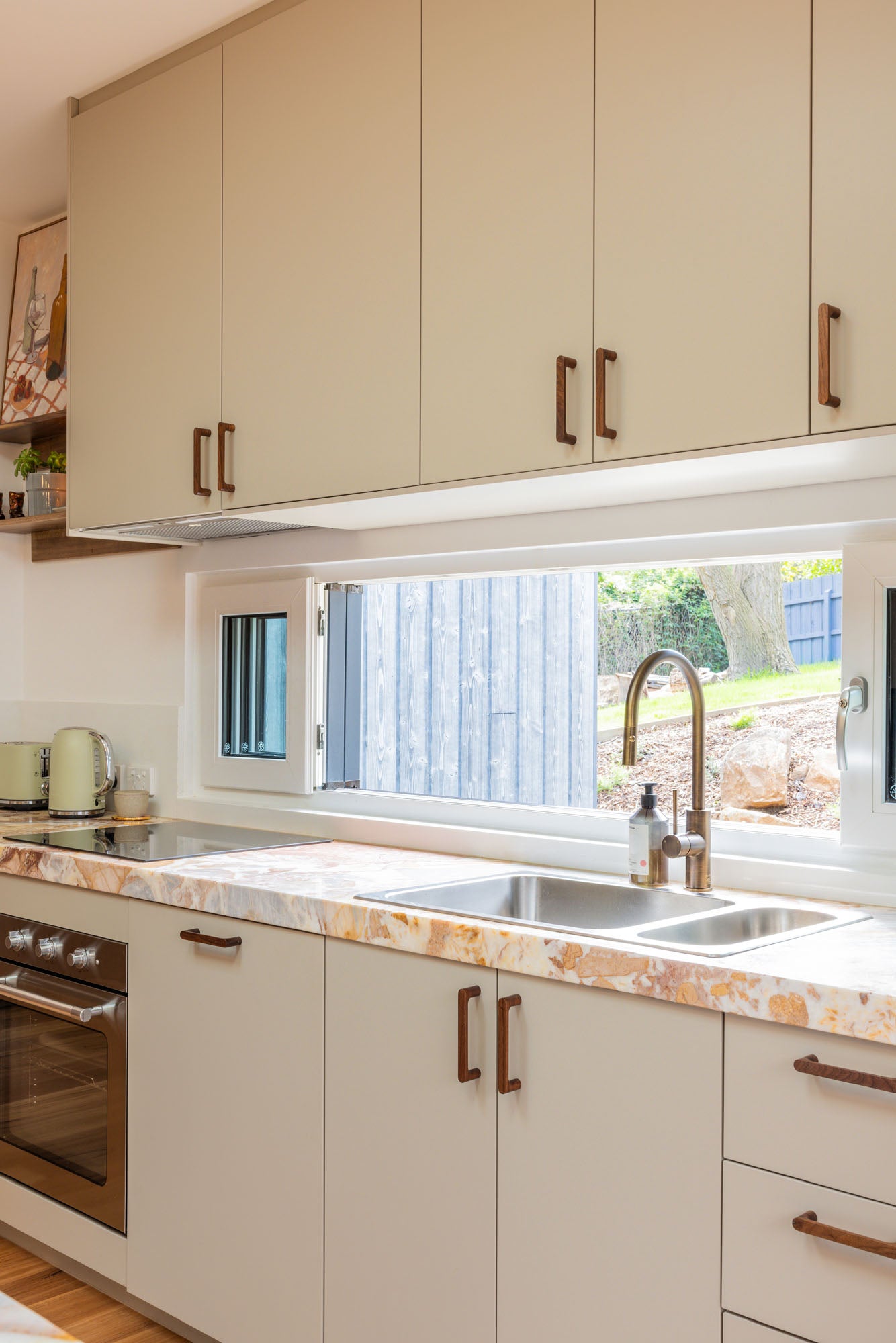 The kitchen and laundry are finished with Blue Patagonia stone, chosen for its natural variation and warmth. It brings texture to the space without overwhelming it, working comfortably alongside simple cabinetry and honest hardware.